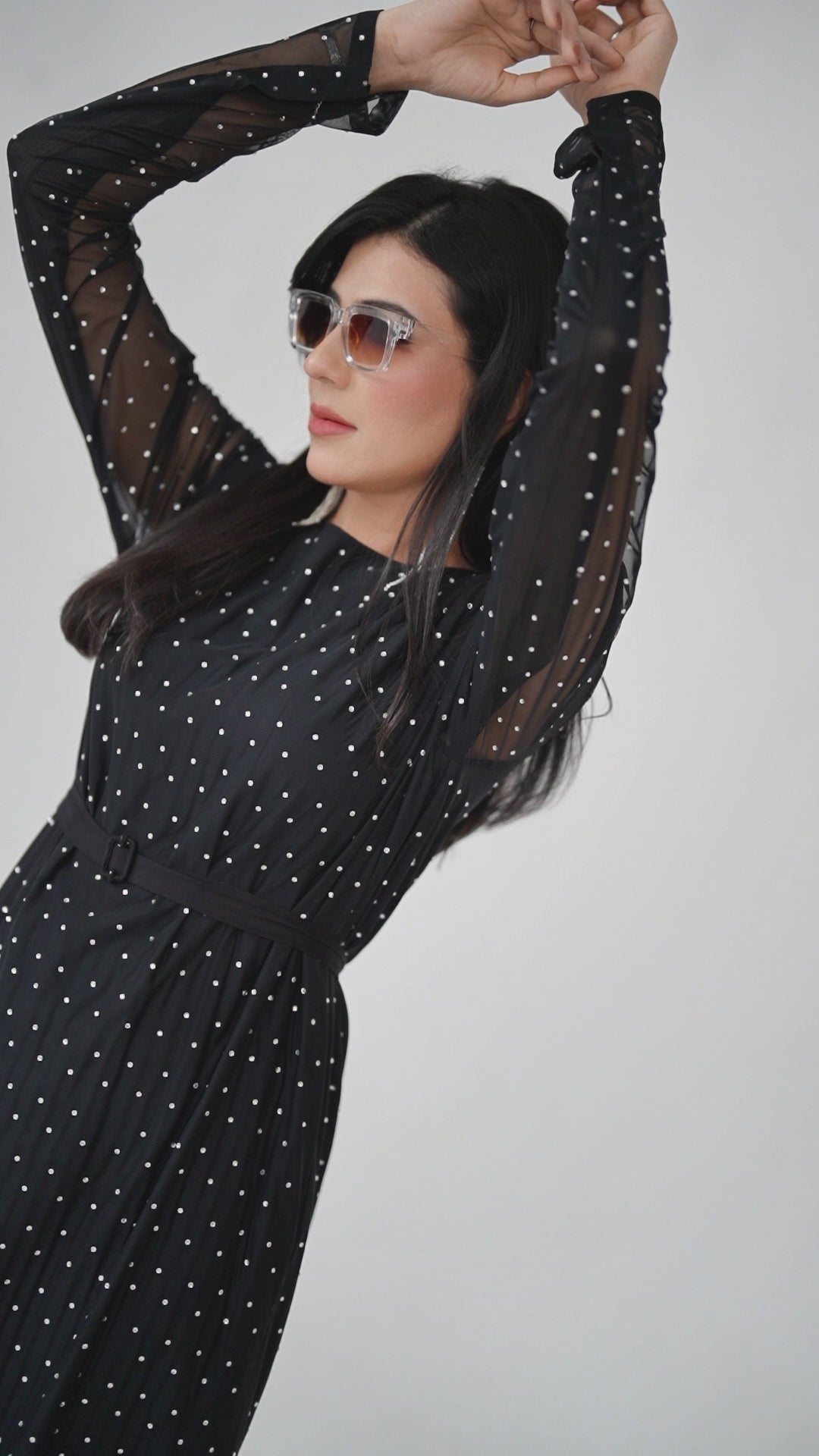 A timeless black dress with a touch of sparkle — Celestial is designed for the woman who owns every room she walks into. With its soft sheer sleeves and delicate polka-dot shimmer, this dress brings effortless glamour to evenings, parties, and elegant night-outs.