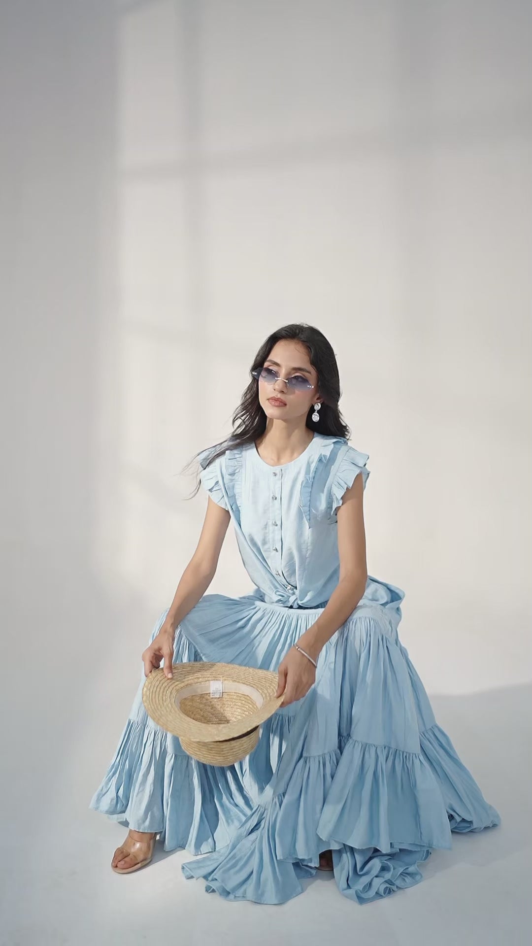A front-open, sleeveless frill crop top adorned with delicate silver-tone buttons, giving a chic twist to a classic design. The frill detail adds a playful, feminine vibe perfect for brunches, beachside walks, or casual evenings.